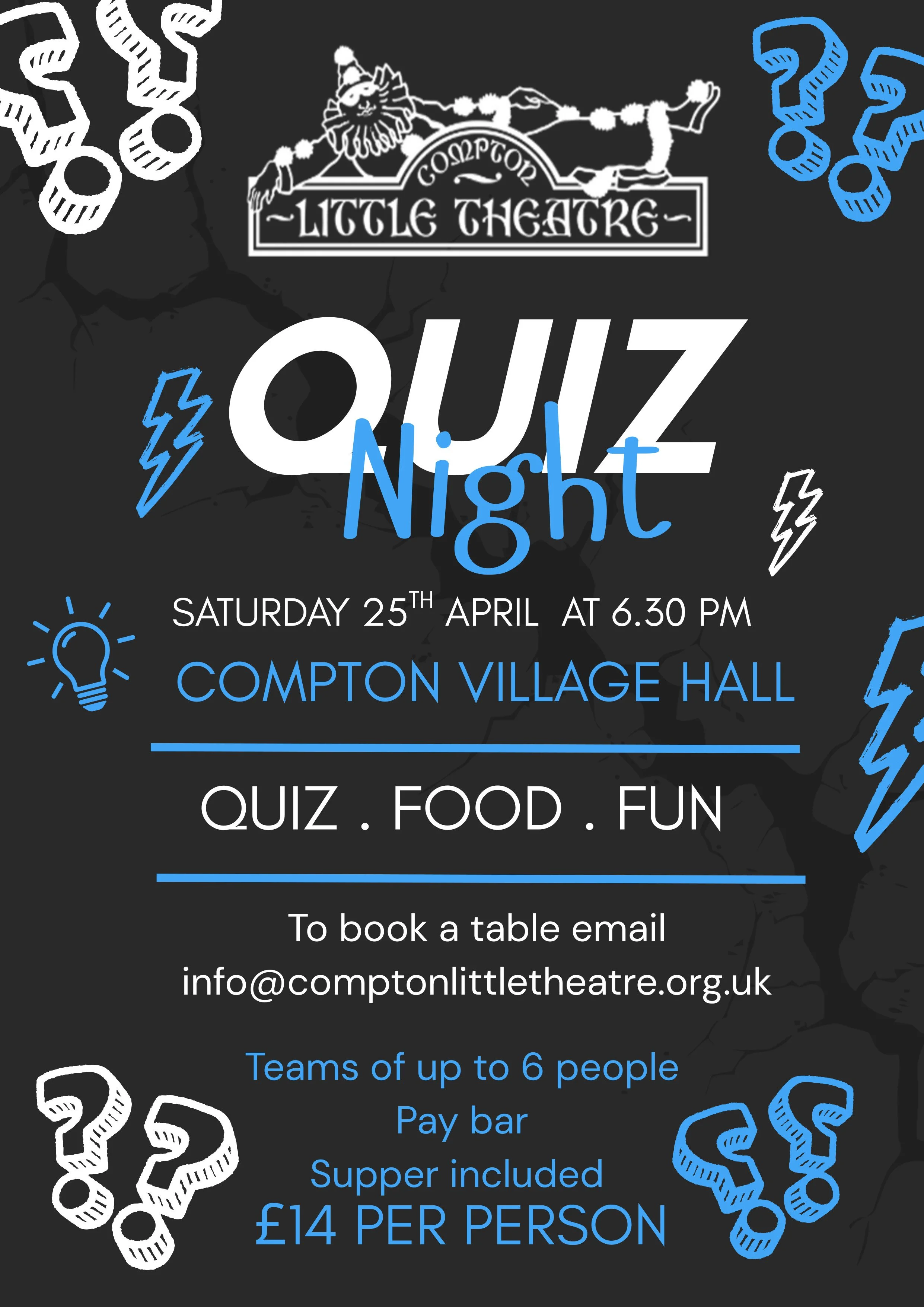 Quiz night ahoy! Jo Ayshford and Rhona Wilkie will once again be hosting their legendary quiz night at the Village Hall. Tickets are £14 each which includes a two-course supper. There is also a pay bar. Teams of six, maximum. Email Rhona Wilkie at info@comptonlittletheatre.org.uk to enter your team, book tickets and to provide dietary requirements. Saturday 25 April, Compton Village Hall, Doors open at 6.30pm for a 7pm start.