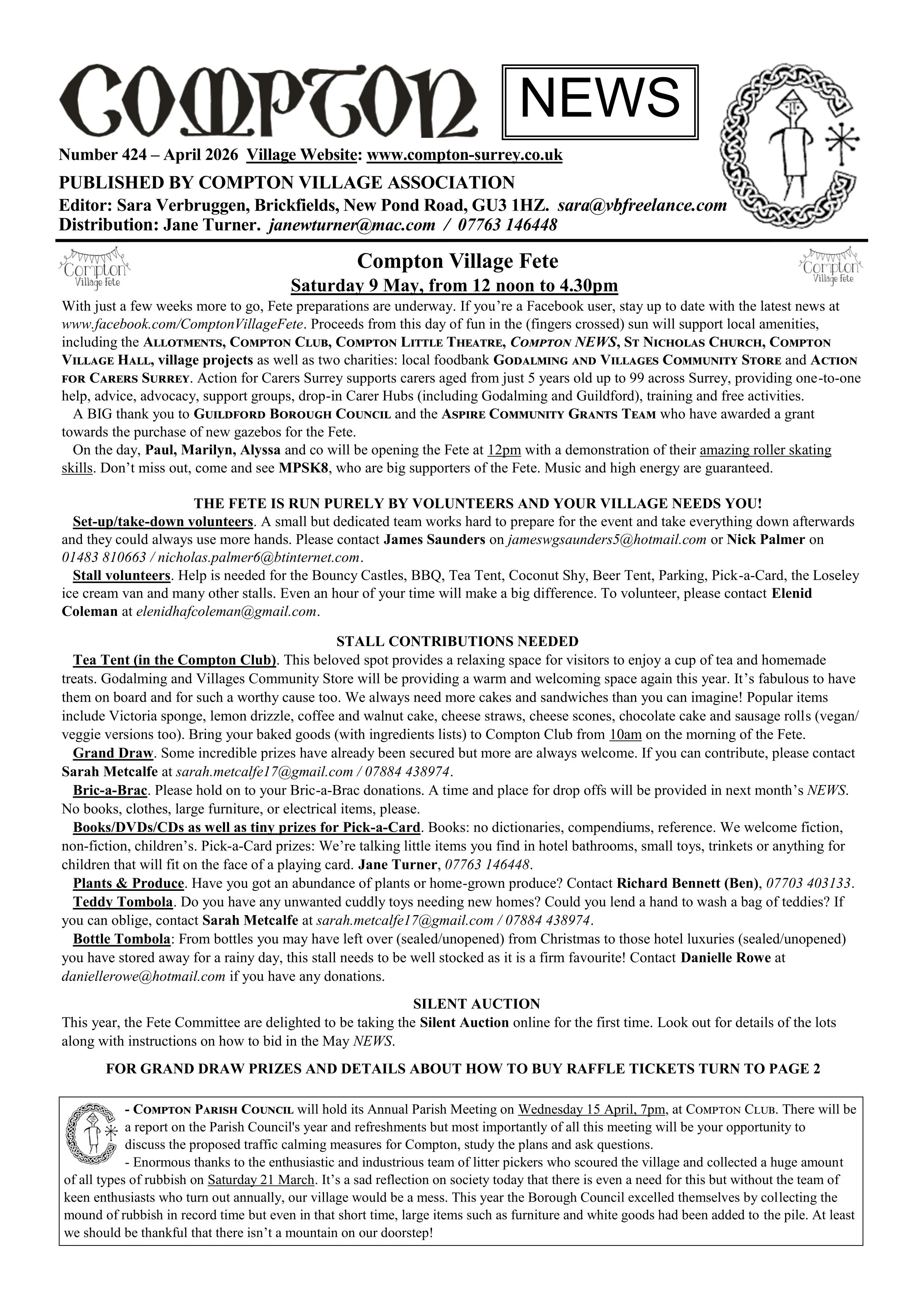 Delivering the NEWS As well as the NEWS being delivered to about 350 properties in Compton and Littleton, Jane Turner sends out over 600 by email. Over the years, the list of those who receive it by email has increased. At the same time, a fair number continue to prefer to receive a hard copy delivered to their door. This will not change. However, for those who receive a hard copy but are happy simply to receive the issue by email only, then do let Jane know so that she can amend her records and update the delivery schedule. Please contact Jane with your address so she can adjust the numbers for delivery and also your email address to be added to the online distribution. Jane’s details: janewturner@mac.com / 01483 810789 / 07763 146448.